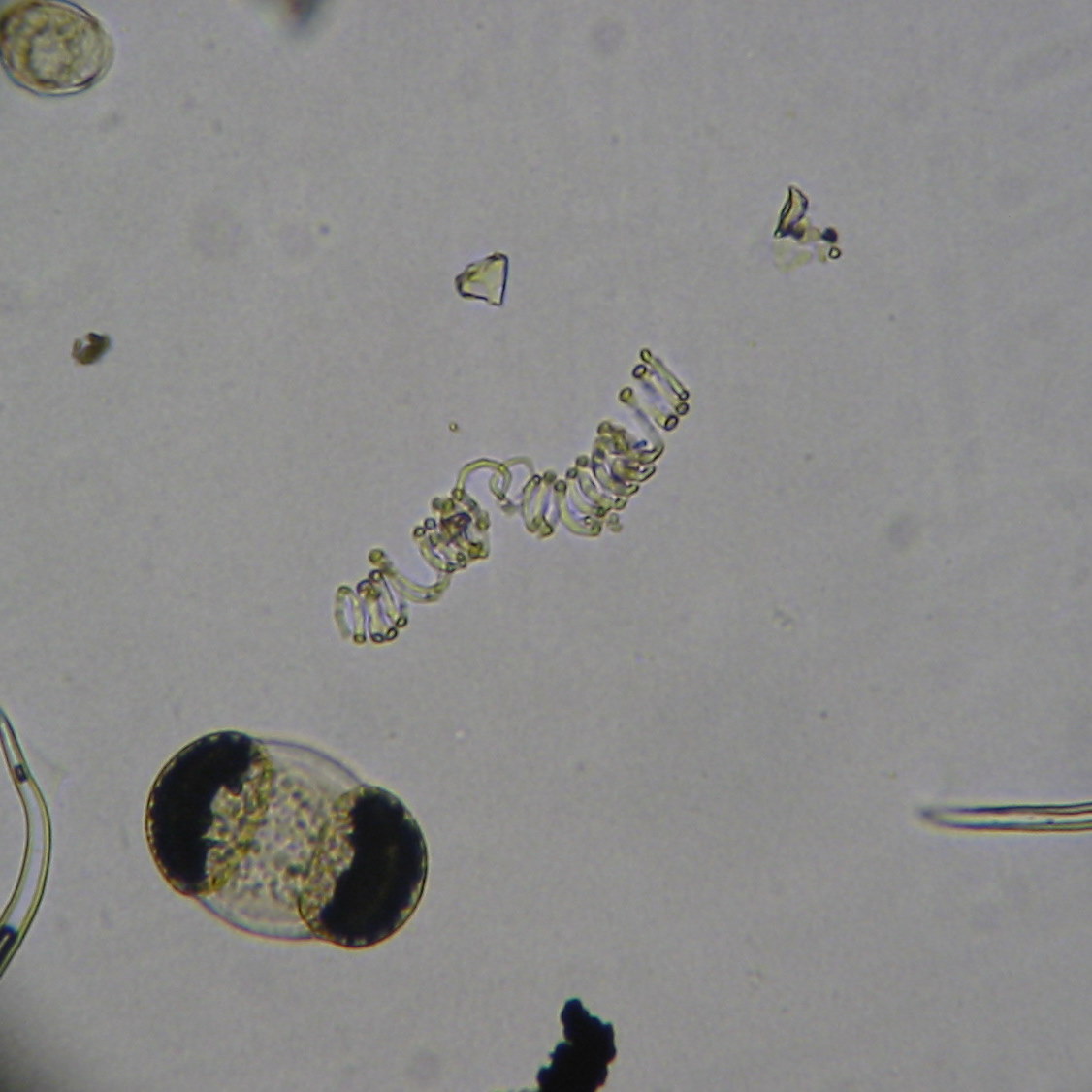 Xylem wall reinforcement thingy, a pine pollen in the bottom left, part from a trichome next to it and in the lower right, unknown pollen grain upper left and some trichomes next, and some unrecognizable pieces