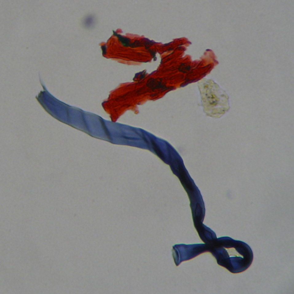 Air sample from my office - artificial fiber, whiteboard marker dust, and a skin cell