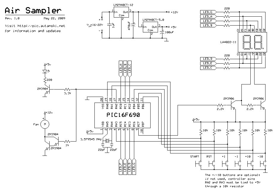 The air sampler is based on my Countdown Timer project, with some minor changes. I power it from a 15V DC adapter and the LM2940CTs are getting quite hot, especially when the fan is running. Putting heatsinks on the voltage regulators is a very good idea, unless you live in Canada.