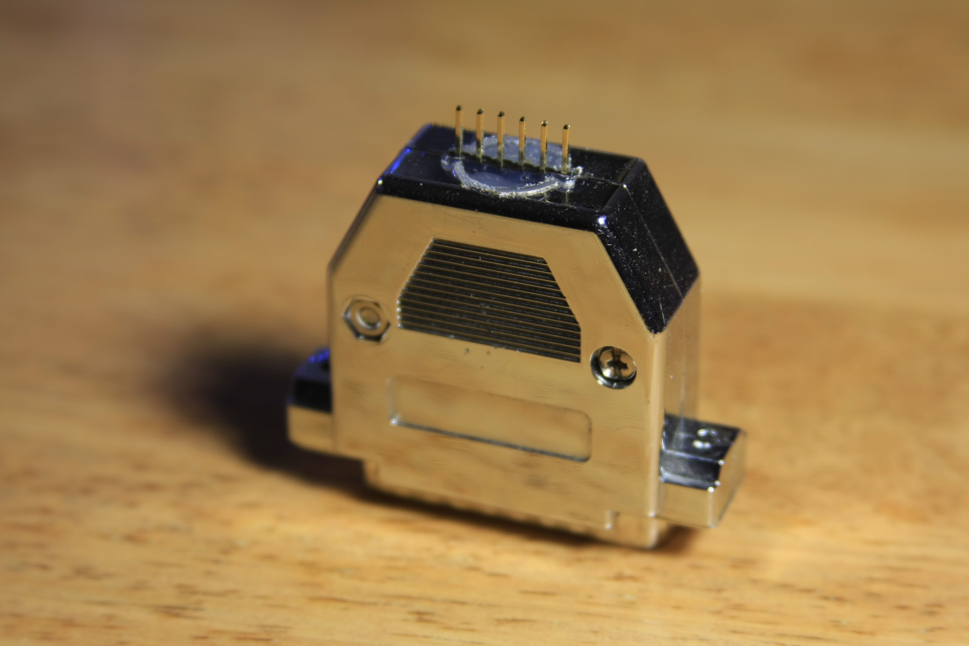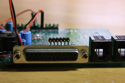 Time to decide what to do about the ports at the back. The main connector can be used to re-program the PIC without taking it out of the box. To do so, I attached some pin connectors to the internal side of the DB-25 leads so the microcontroller board can be plugged in there later: