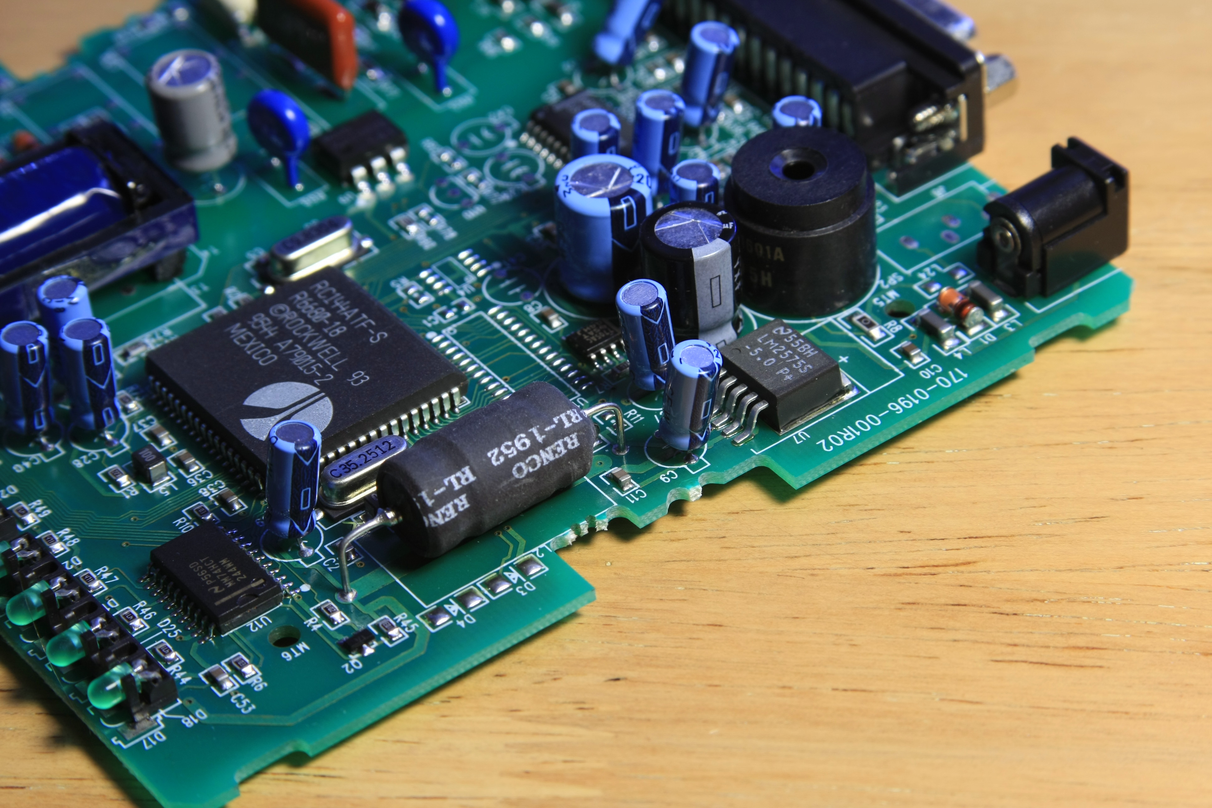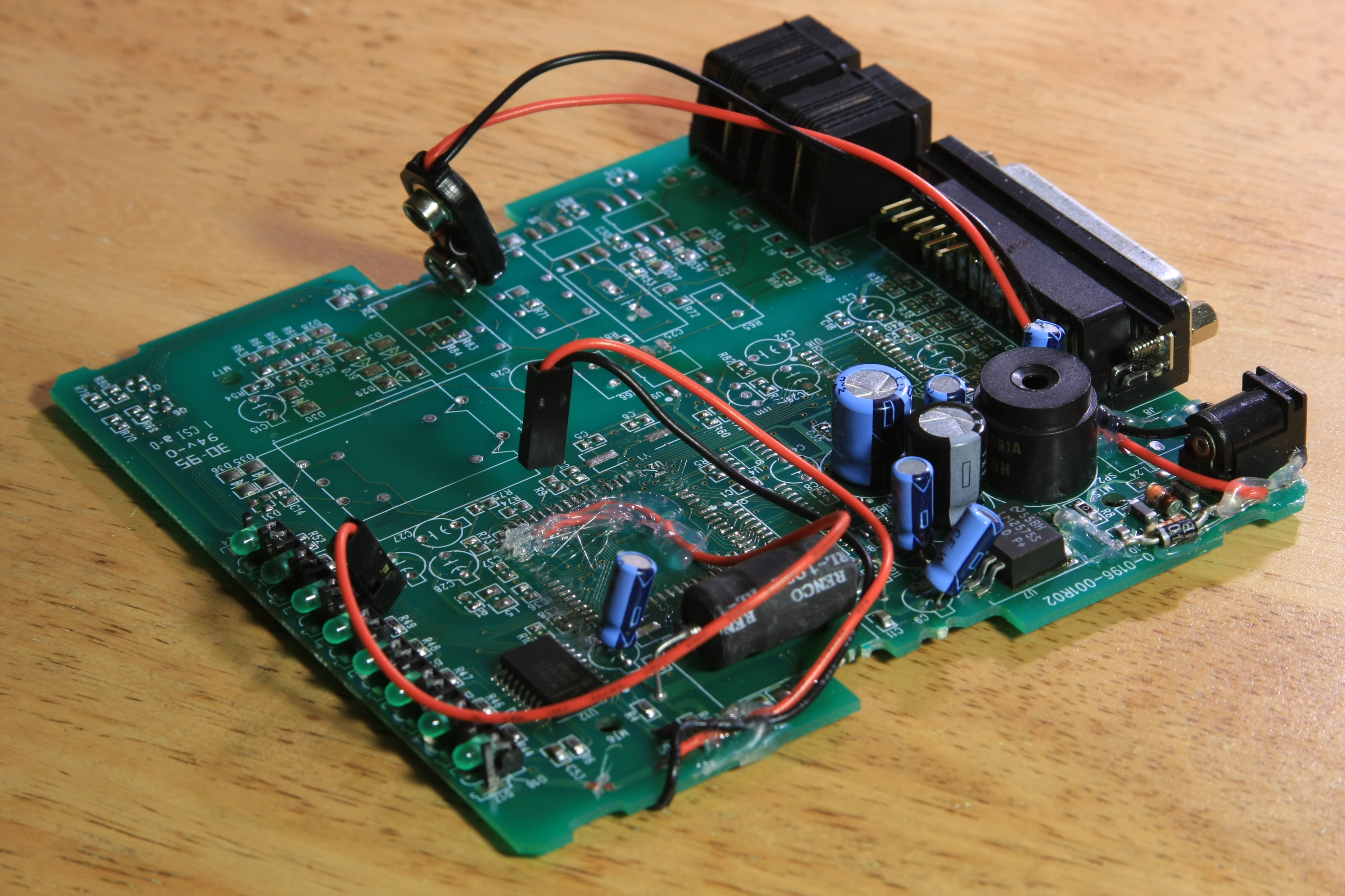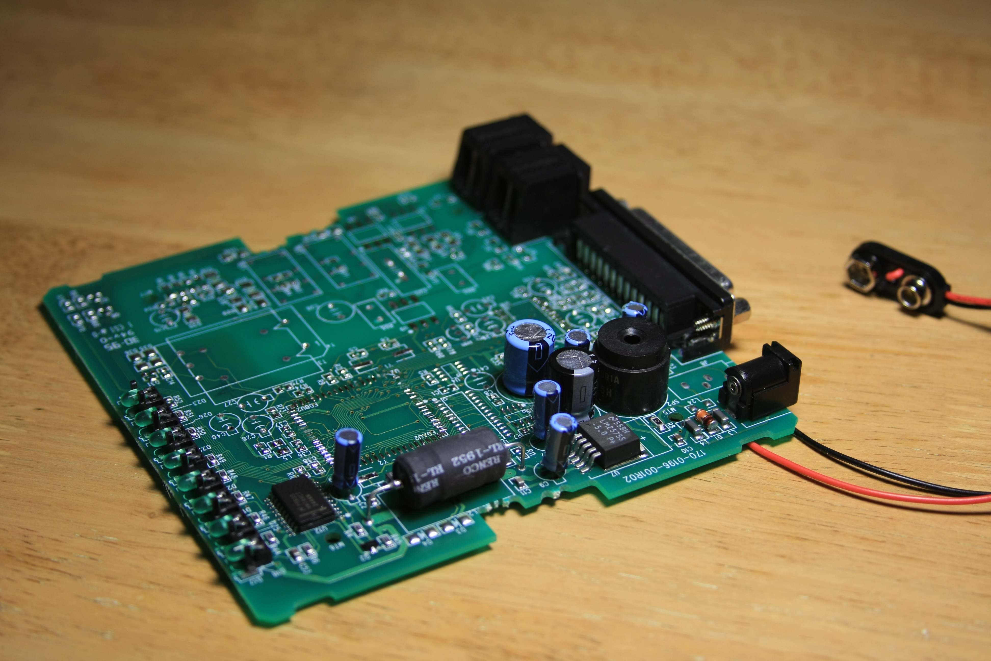 Next comes putting connectors to tap the stabilized 5V of the modem's power supply electronics. Another connector attaches to the modem's internal speaker amplifier (an easy to find LM386). Finally, I added a 9V connector for the rechargeable battery, along with a simple trickle-charger composed of a 2.2k resistor and a diode glued to the modem board: