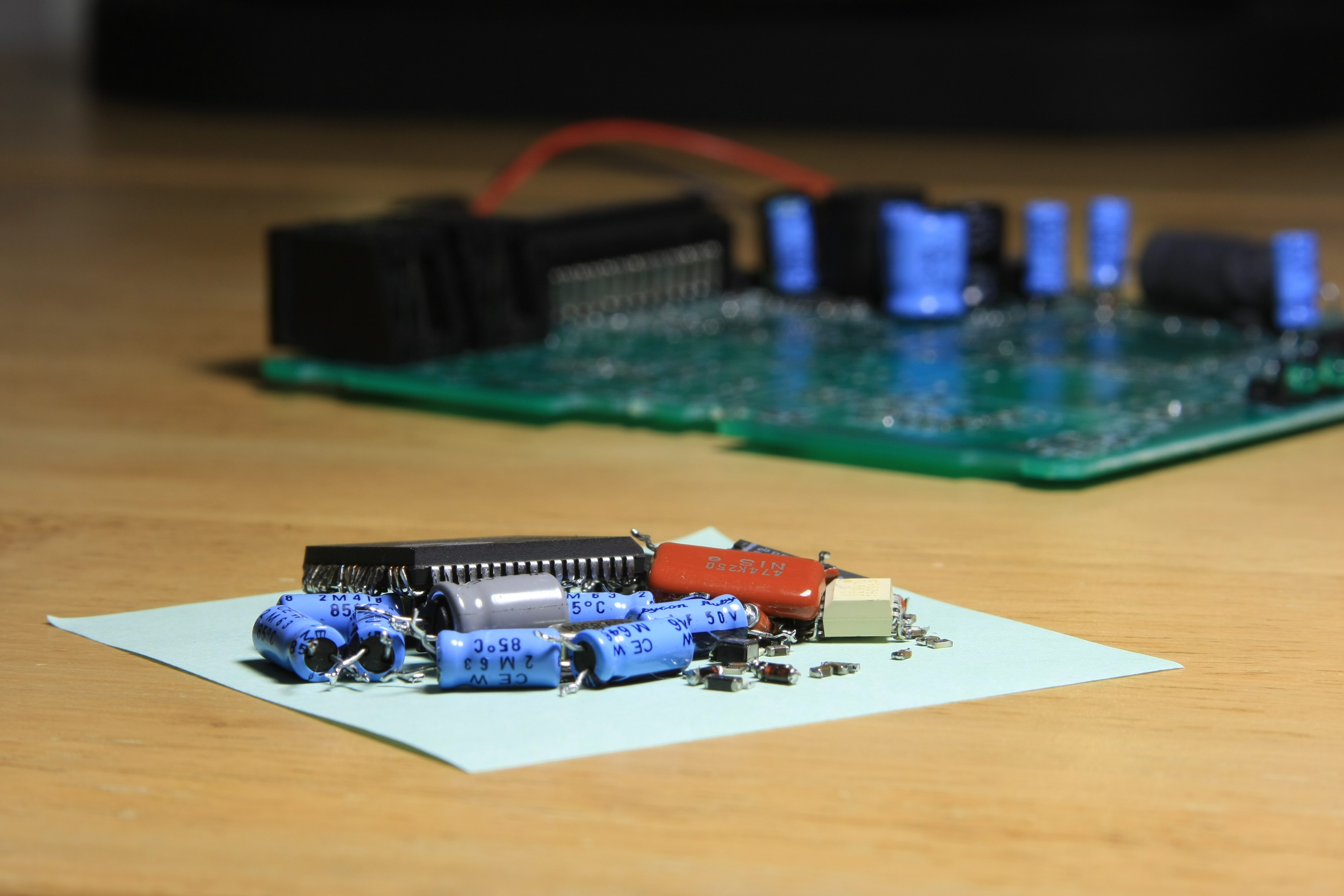 The board where the PIC and the rest of the electronics will sit is quite simple. Since we already have the speaker amplifier and the power supply, what's left is mostly connecting wires. Here is the board, in all its red-and-black glory: