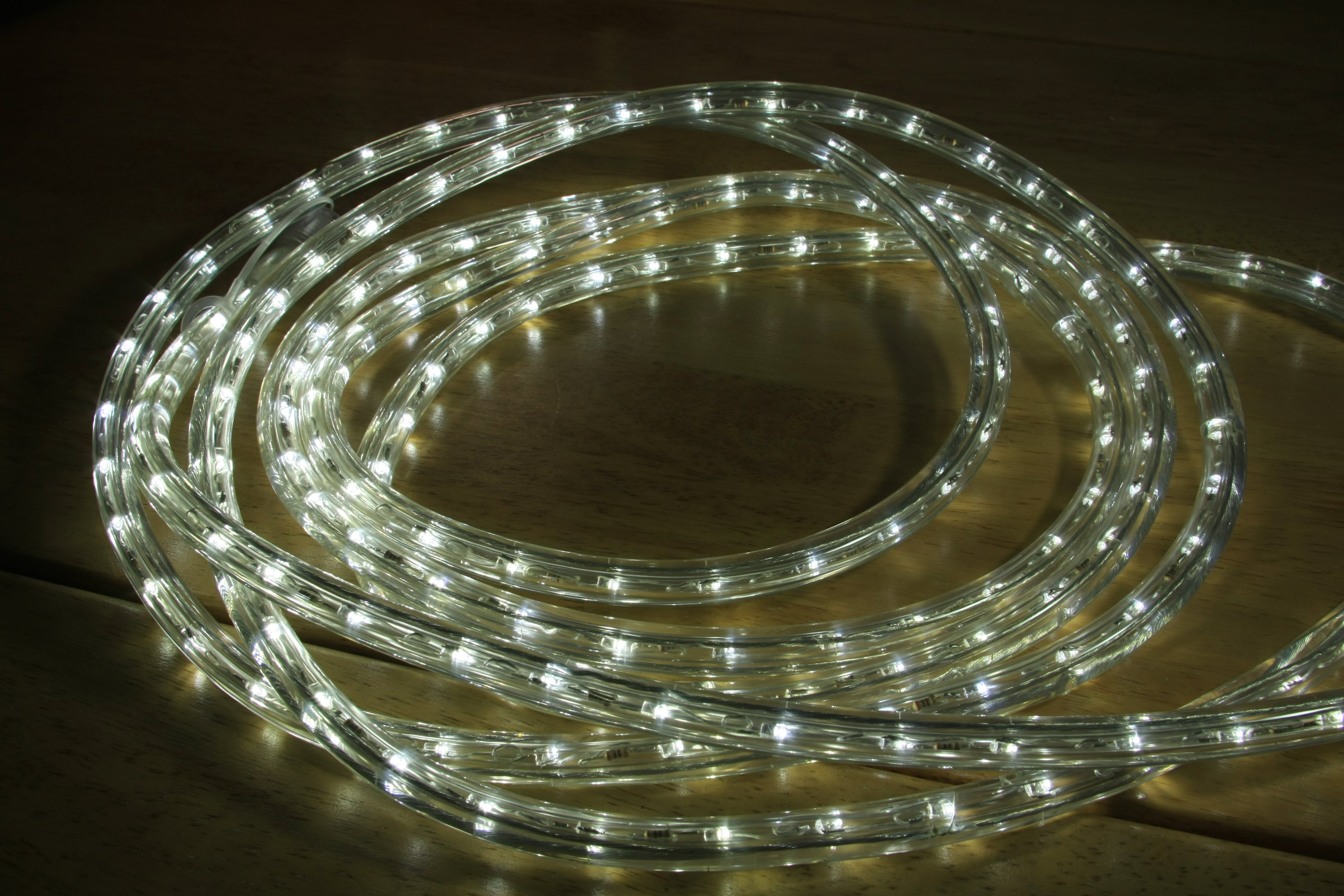 The rope is made of 210 high-brightness soft-white LEDs enclosed in a plastic tube: