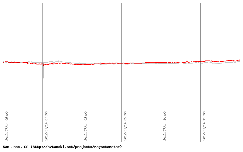 For an example of what you should be looking for, take a look at the two graphs to the right. The first one was recorded during the (local) night on July 14, 2012 while the Earth's magnetic field was quiet. The record from the next night, July 15, shows a moderate magnetic storm in progress.