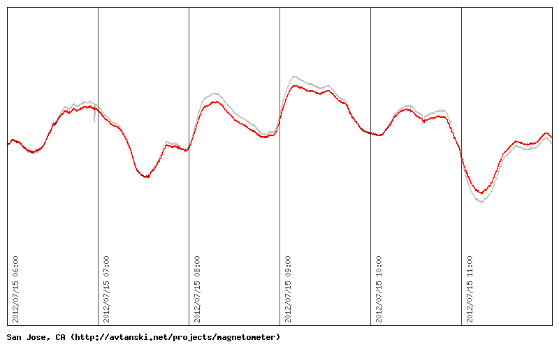 If you zoom on any of the images you will notice two traces on the graphic. One, in light gray, is the raw data, as it comes from the magnetometer. The other trace, in red, is the filtered data. The filtering algorithm attempts to remove or at least reduce the artificial noise caused by cars, bicycles, and so on.