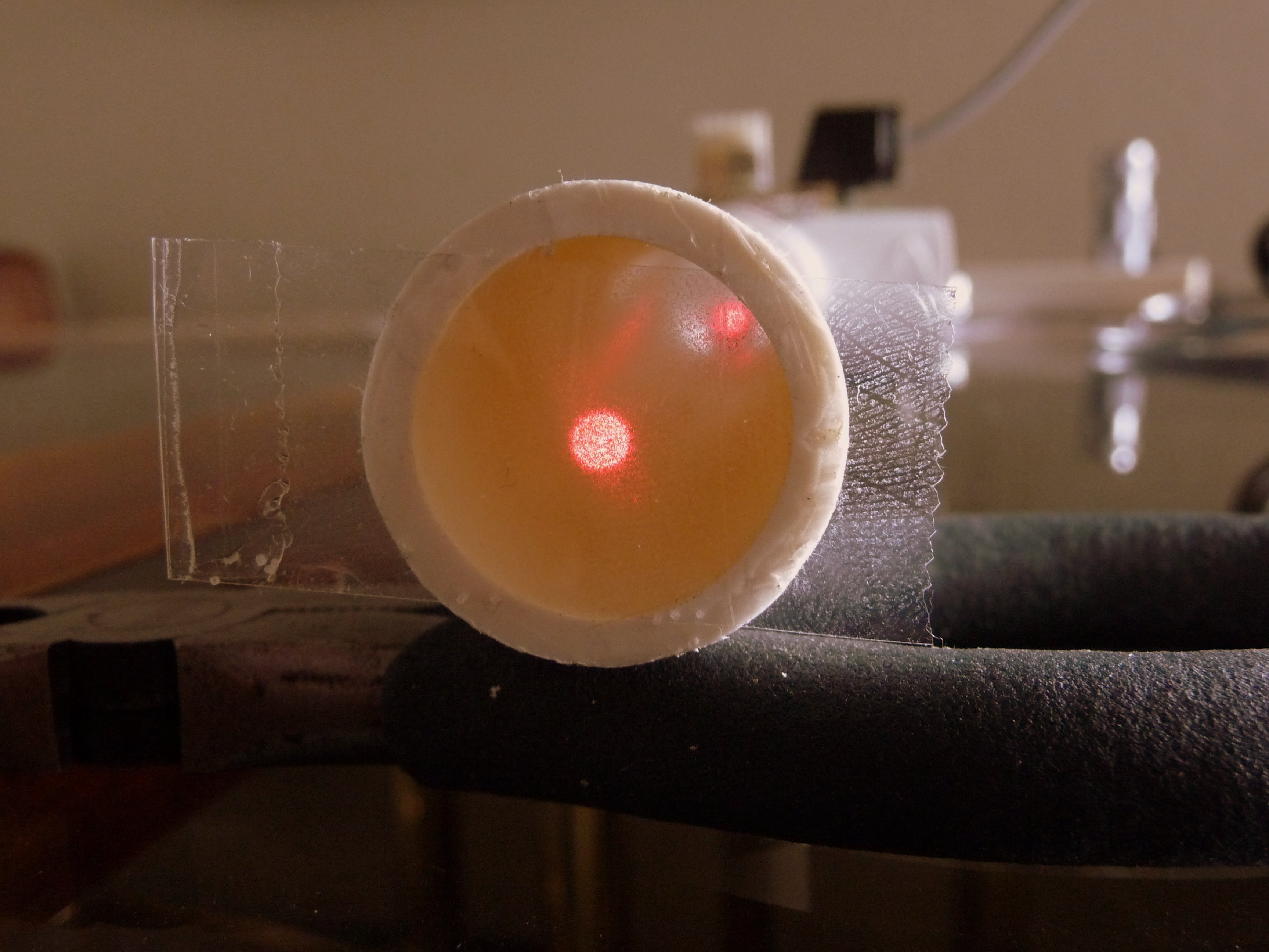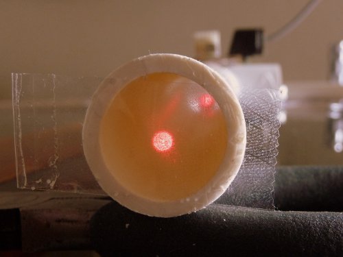 After attaching the horizontal pipe that connects the laser/sensor assembly to the mirror cell, the laser has to be aligned. Attaching a piece of scotch tape makes the laser beam visible and by adjusting the supporting screws laser can be accurately centered: