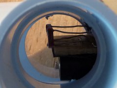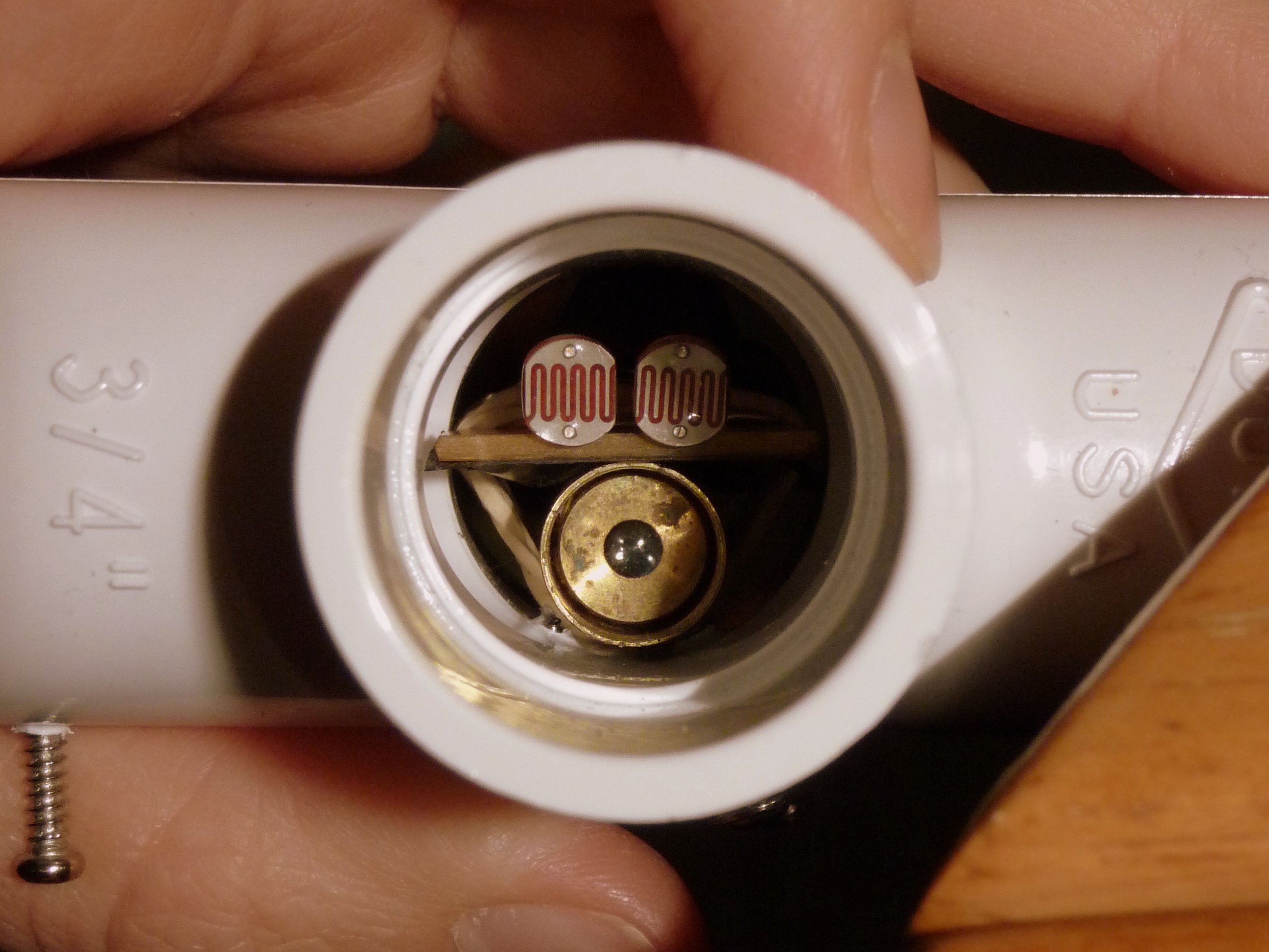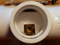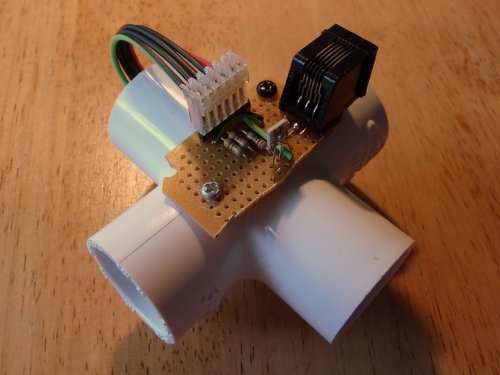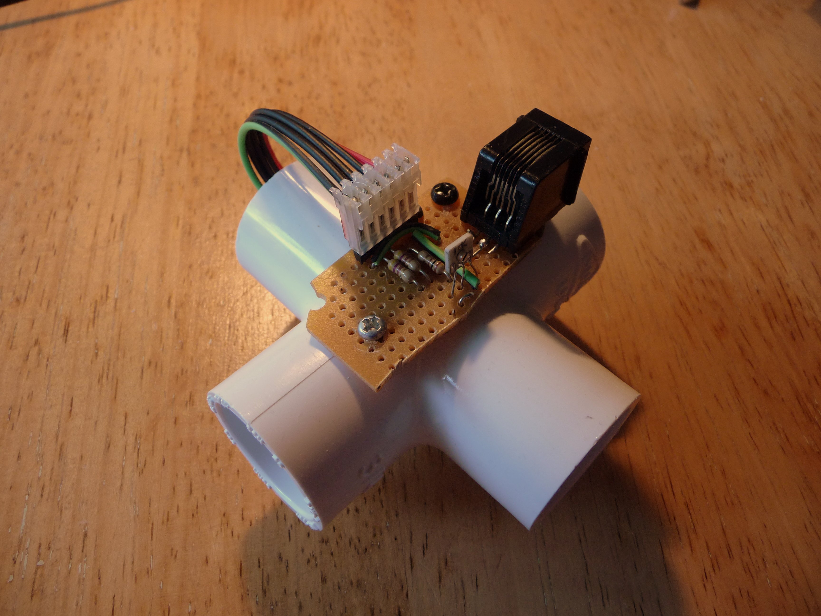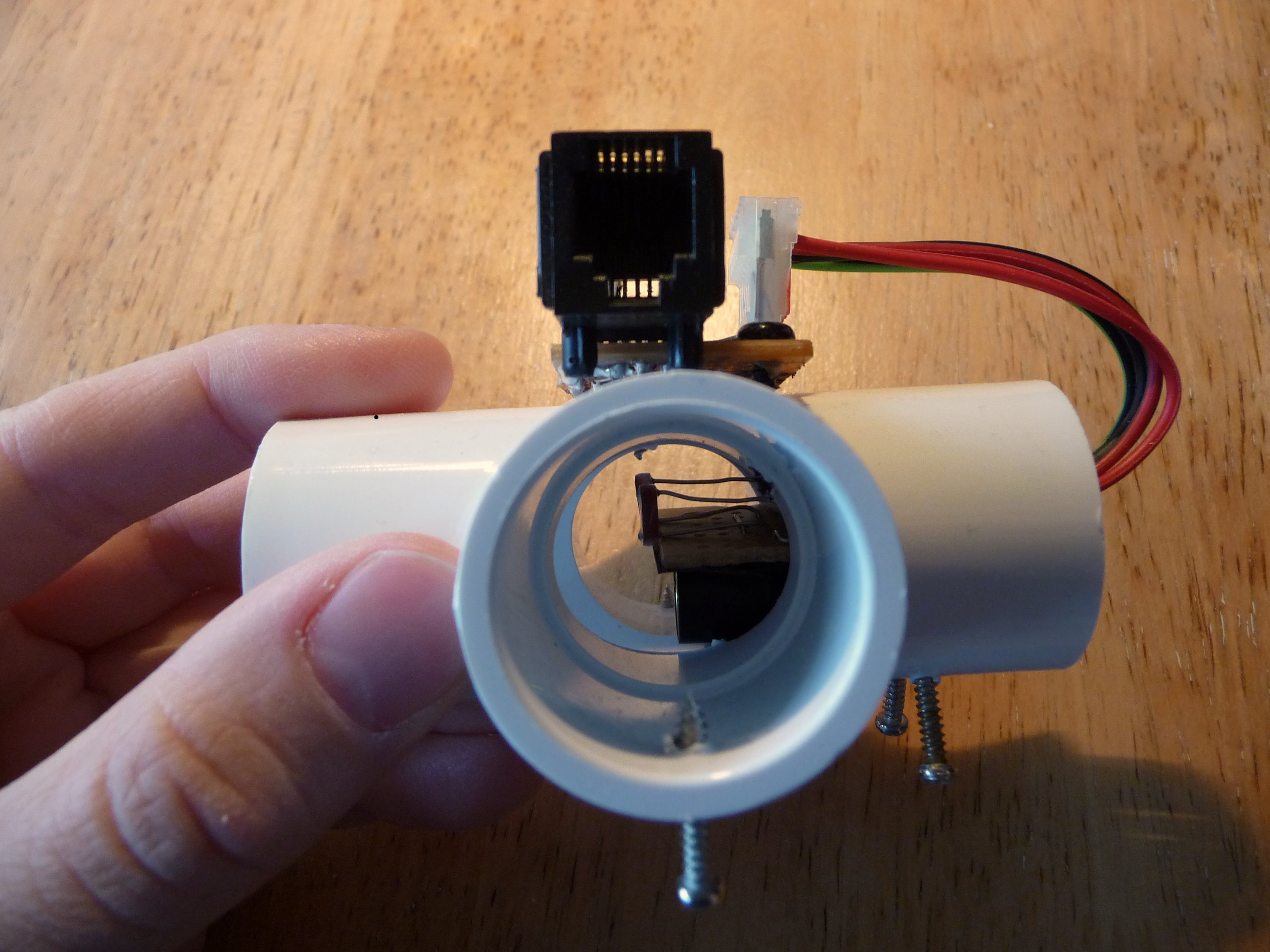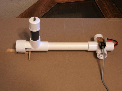 I picked a PCV cross-joint to hold the laser/sensor assembly. While a straight piece of pipe would work too, the side openings allow me to adjust the magnetometer by peeking inside and seeing where the reflected laser spot is.