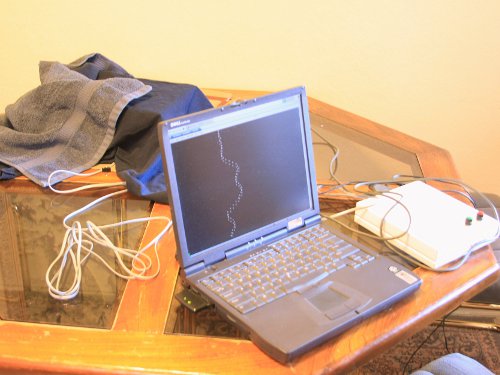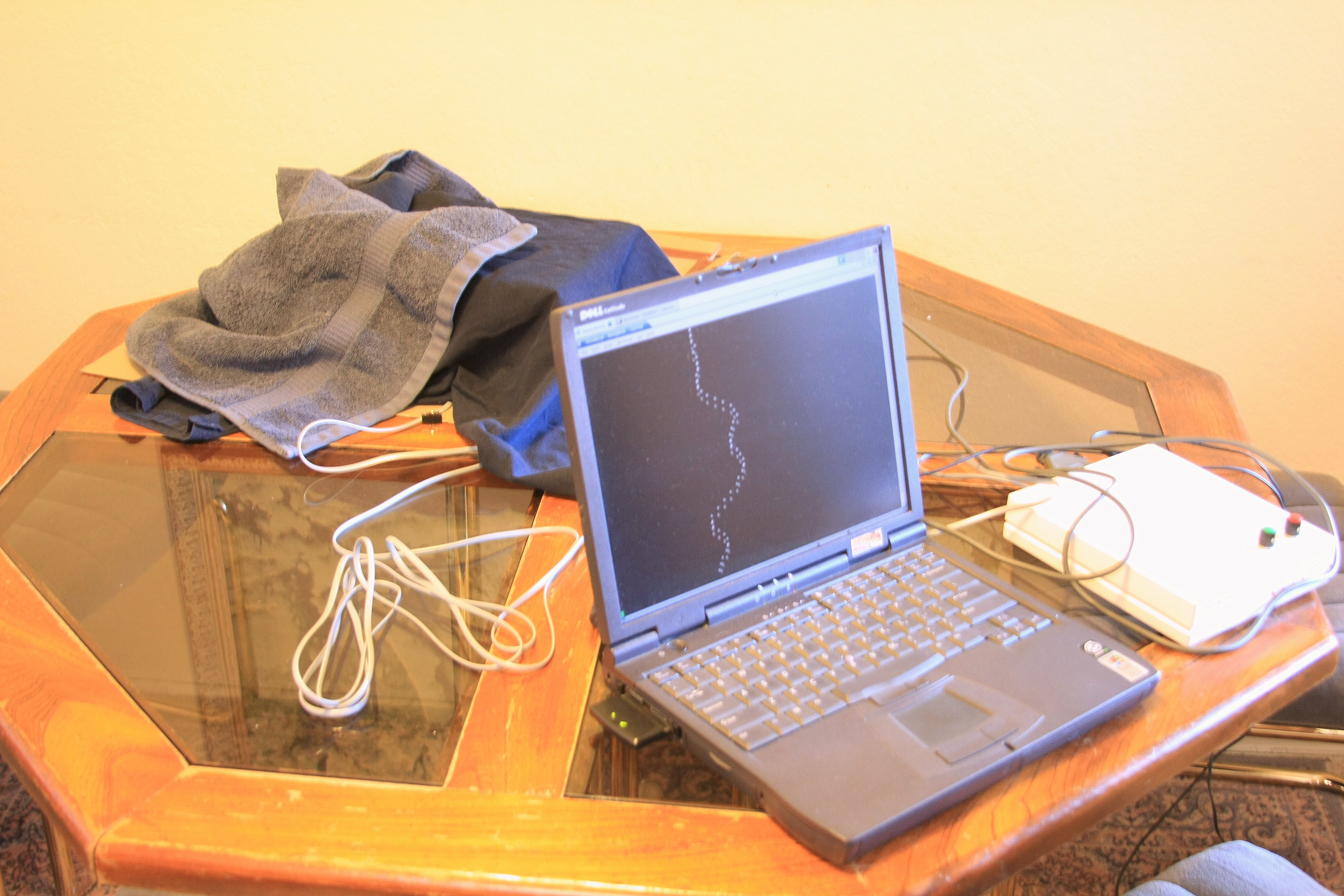The magnetometer is in a cardboard box under the heap of towels. The box and the towels are there to keep the sensor from picking any stray light during testing and calibration. The sensor is connected through the data logger (described separately here) to an ancient laptop. The trace you see on the screen is the actual movement of the mirror.